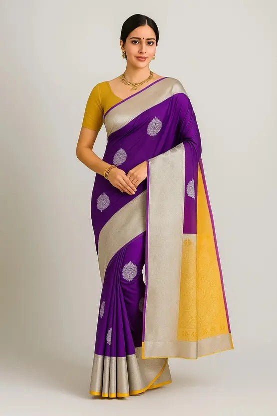 Floral Print Banarasi Cotton Blend Saree (Purple)